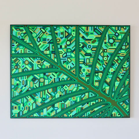 In this painting, my aim was to highlight the intricate details found in nature when we take the time to look closely. Entitled "Green Microscope," it depicts a leaf in varying shades of green. I wanted the structure of the leaf, such as its veins, to appear abstract. Each shape is contributing to a sense of order and intention, collectively forming the essence of the leaf.
