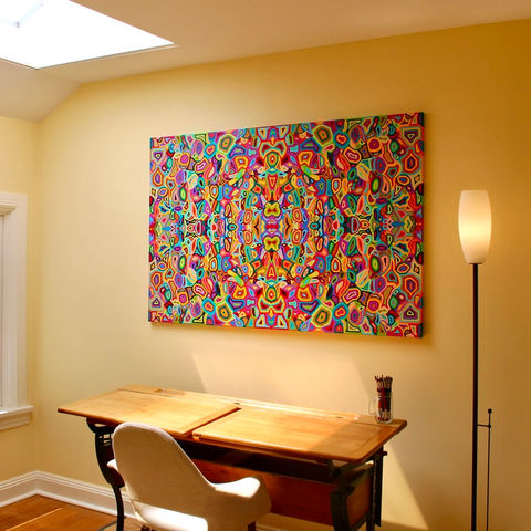 This painting can be displayed both horizontally and vertically, with each orientation completely changing the canvas's dynamics. Similar to a kaleidoscope, its intricate symmetry is crafted with the intention of revealing something new each time, allowing space for the viewer's imagination to envision what they desire.
