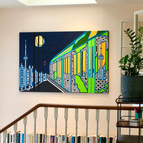 In this painting, which draws inspiration from Toronto, the vibrant colours of the train, city, and moon stand out vividly against the dark night sky and pavement of the background and foreground. Titled "Nuit Blanche," it was created to depict the tranquility and stillness of the night in stark contrast to the never-ending, frenetic energy of the city.