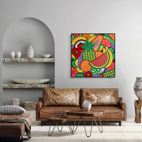 In this painting, I depicted various fruits in vibrant colours, filling the entire canvas as I often do. I added patterns and details to each fruit to personalize them and invite the viewer to look closely at each one, making you want to grab one and savor it.